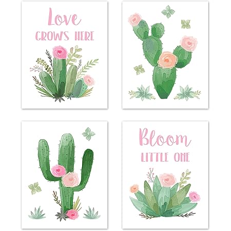 Amazon Com Sweet Jojo Designs Pink And Green Boho Wall Art Prints Room Decor For Baby Nursery And Kids For Watercolor Cactus Floral Collection Set Of 4 Love Grows Here